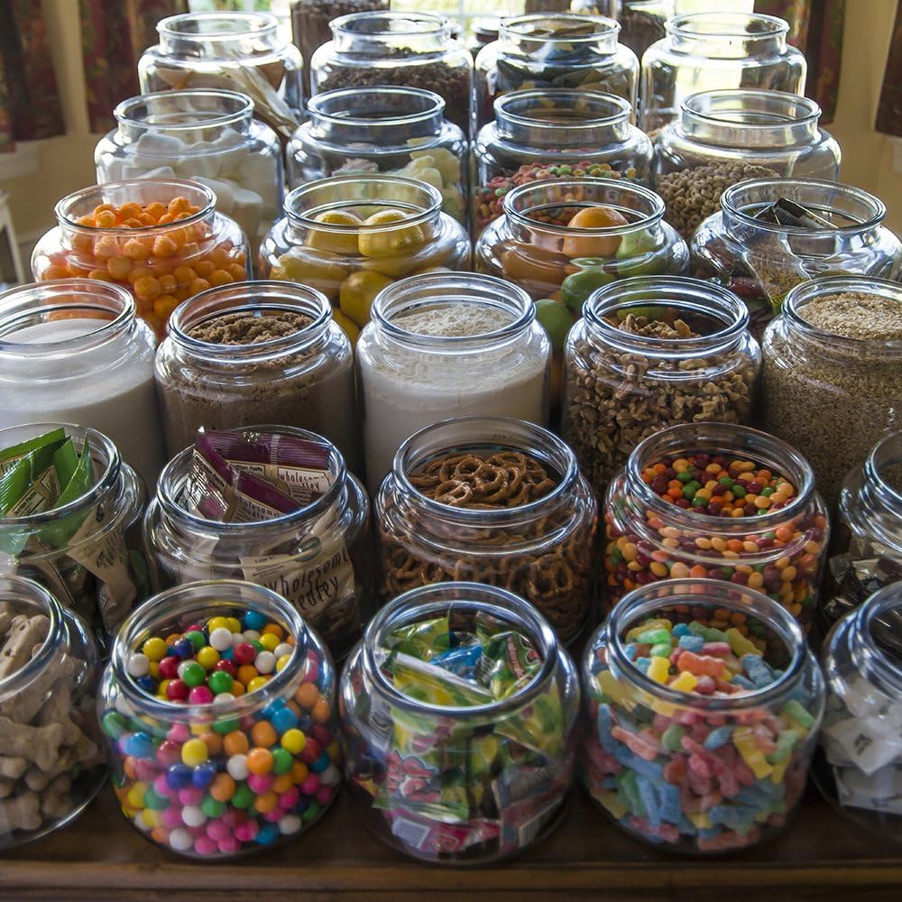 - USE: These glass jars are perfect to display all manner of dry goods including flour, rice, coffee, sugar, spices, and candy. But that’s not all. Make ideal cookie jars and cat and dog-treat containers.