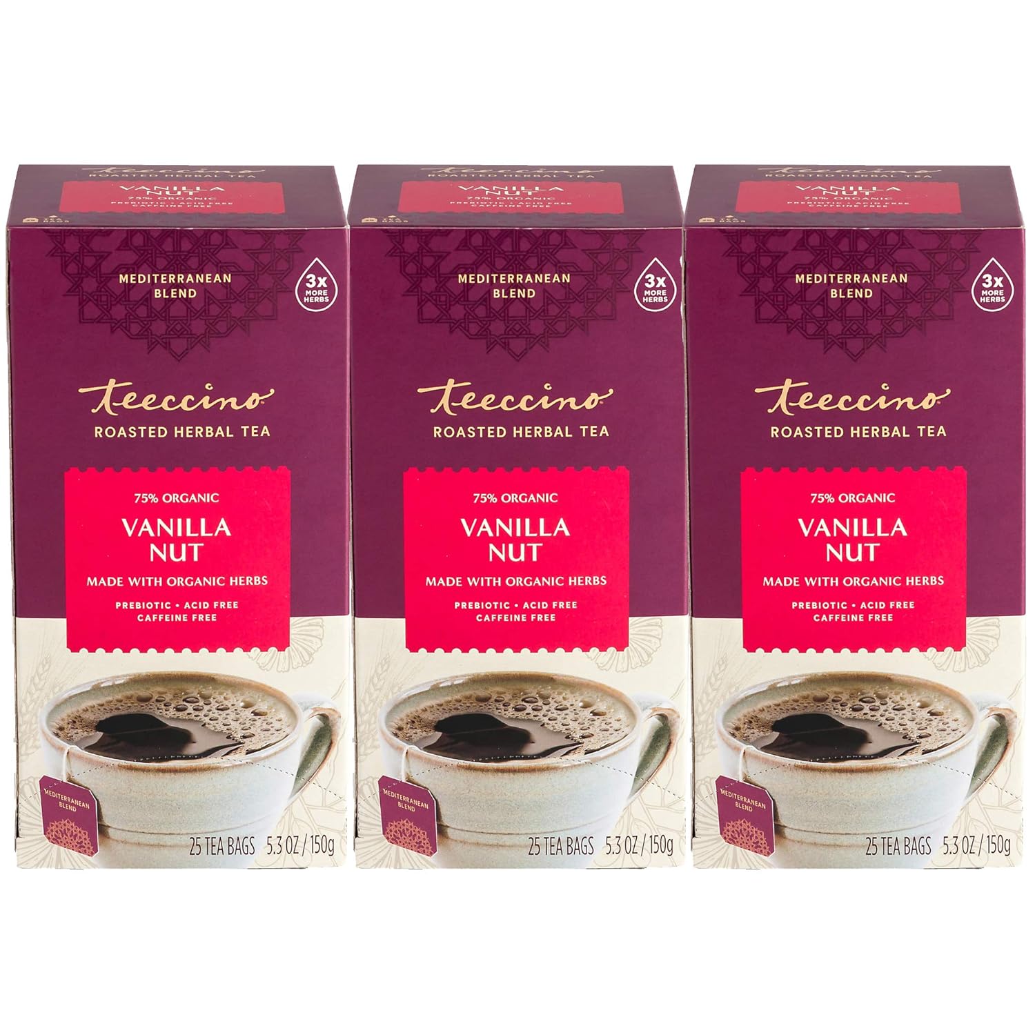 Teeccino Vanilla Nut Herbal Tea - Rich & Roasted Herbal Tea That’s Caffeine Free & Prebiotic for Natural Energy, 25 Tea Bags (Pack of 3)