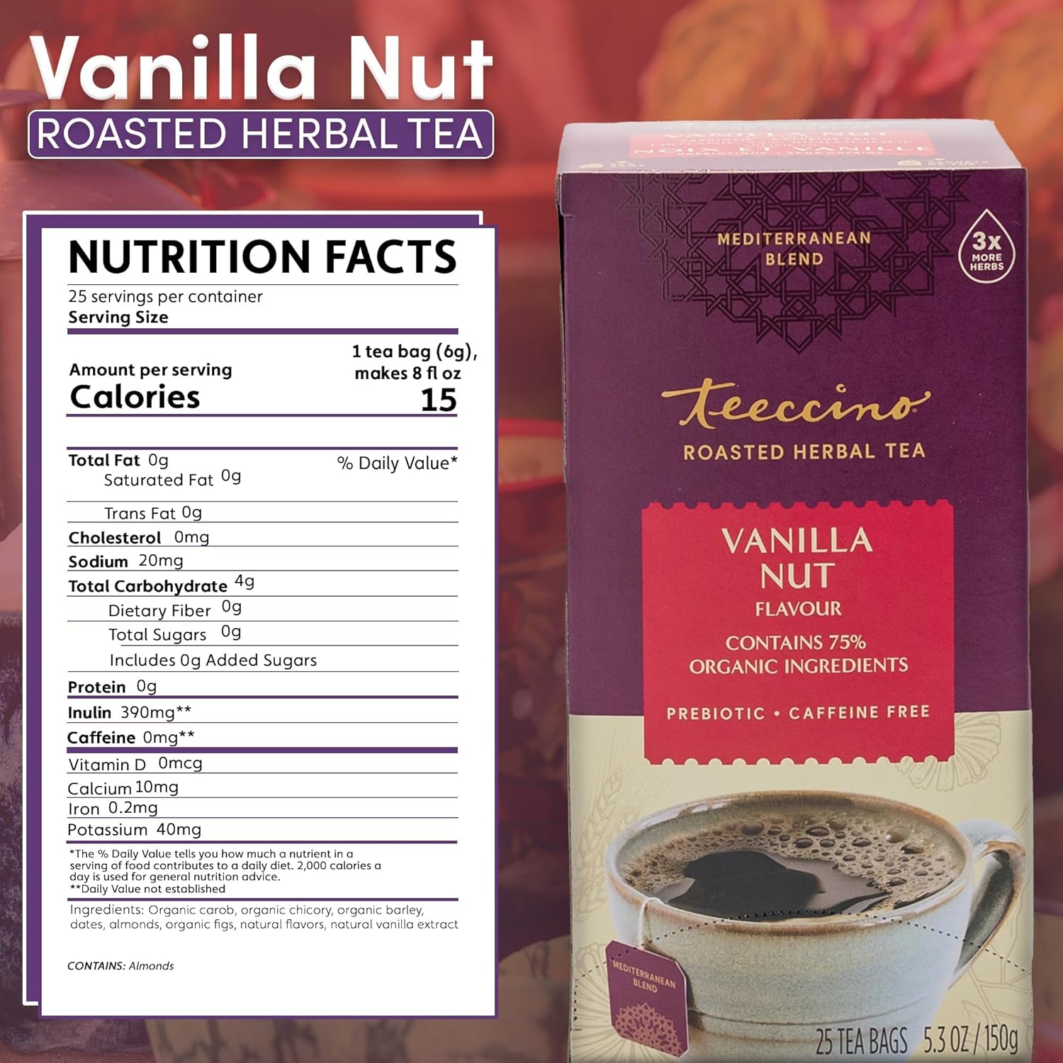 - RICH & BOLD HERBAL TEA - Enjoy a delicious low-calorie dessert tea or wake up tea featuring creamy vanilla & golden roasted almonds. A hint of sweetness from dates and figs.