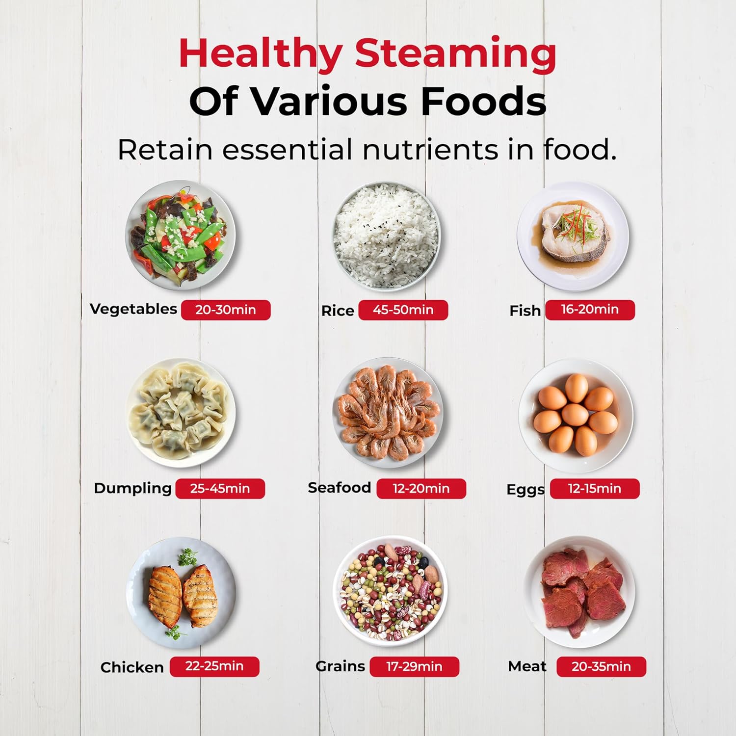 - COOK A VARIETY OF FOODS -- Perfect for Weekly Meal Preps: Food steam cooker allow you to cook a wide range of foods simultaneously, ideal for steaming rice, vegetables, meat and fish, which provides one of the healthiest ways to cook for dinner, minimize the loss of nutrients and vitamins. Especially good for baby. This steamer can do it all. Make a delicious full meal for your family within minutes.