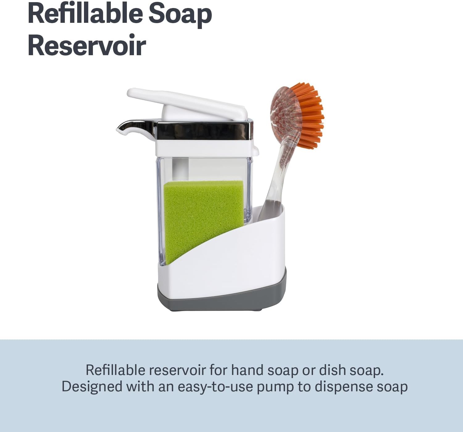 - REFILLABLE SOAP RESERVOIR: Can be used for hand or dish soap and is designed with an easy-to-use pump so you can dispense soap onto your sponge with one hand