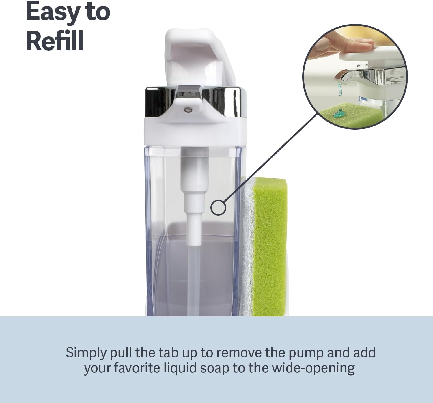 - EASY TO REFILL: Simply pull the tab up to remove the pump and add your favorite liquid soap to the wide-opening bottle