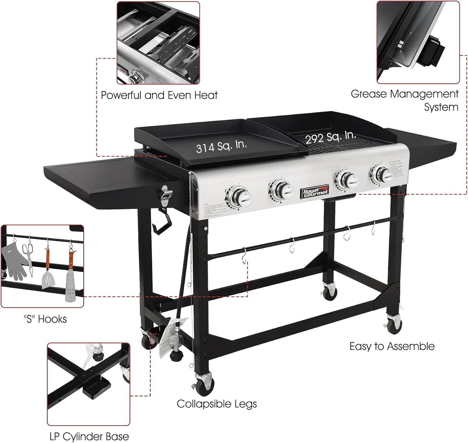 - Combo Design: Combination of gas grill and griddle with two individual cooking zones, each has 292 sq. inches for cooking, totaling 584 sq. inches of cooking space, over 4 burners with an output of 48,000 BTUs.