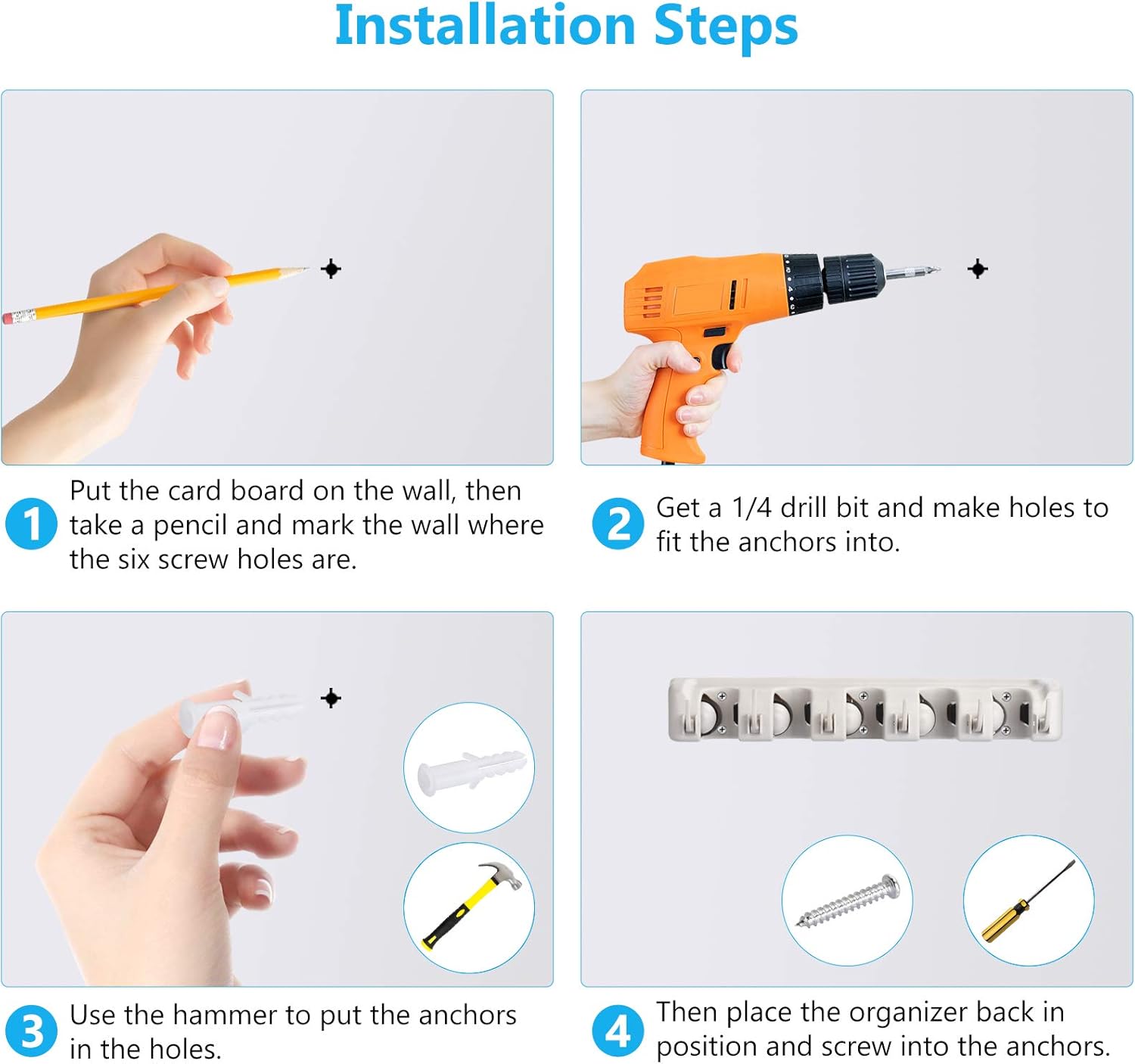 - Broom and Mop Holder Wall Mounted with Screws Drilling Installation - Fit to Wall Easily and Never Worry The Hanger Will Fall Down on The Next Morning.
