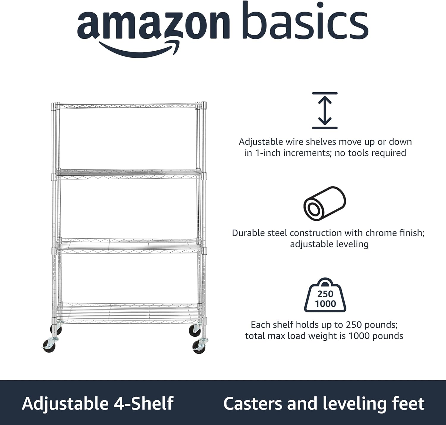 Amazon Basics 4-Shelf Adjustable, Heavy Duty Storage Shelving Unit with Wheels for Easy Assembly, for Garage or Kitchen Use, Metal Organizer Wire Rack, 36" L x 14" W x 57.8" H, Chrome