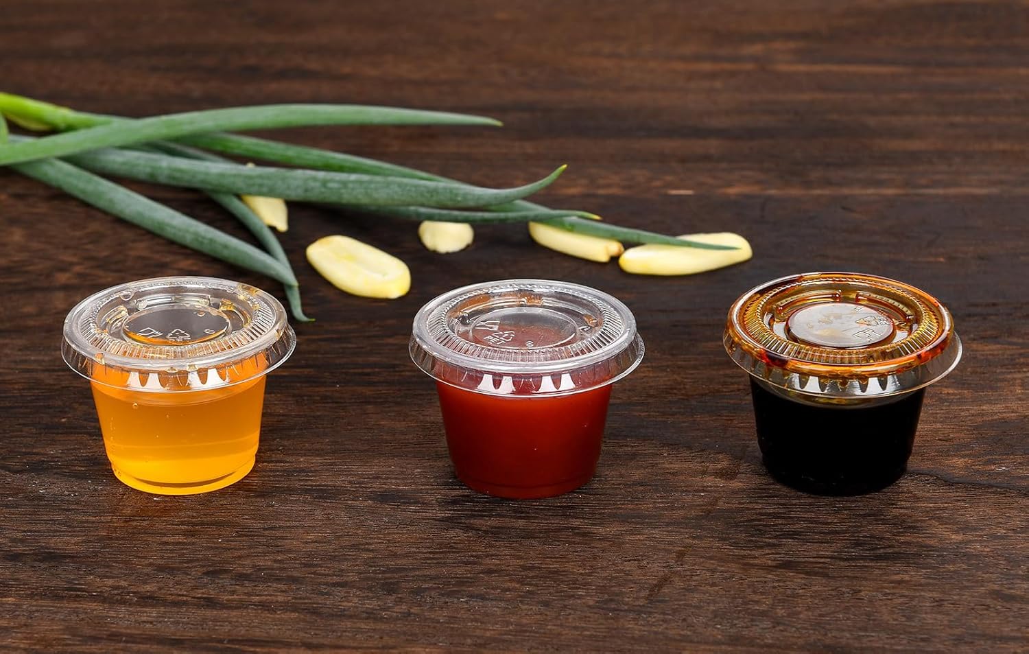 EDI [1 OZ, 100 Sets] Clear Disposable Plastic Portion Cups With Leakproof Lids | Jello Shot, Condiment, Dipping Sauce, Souffle Cups | BPA Free | Recyclable