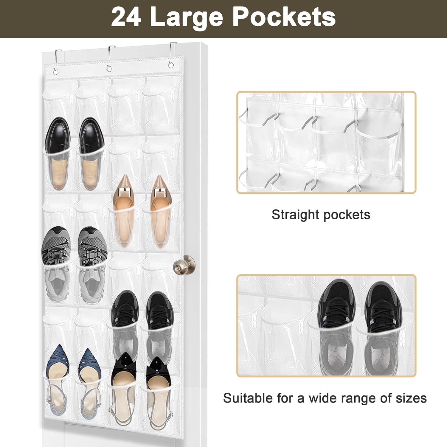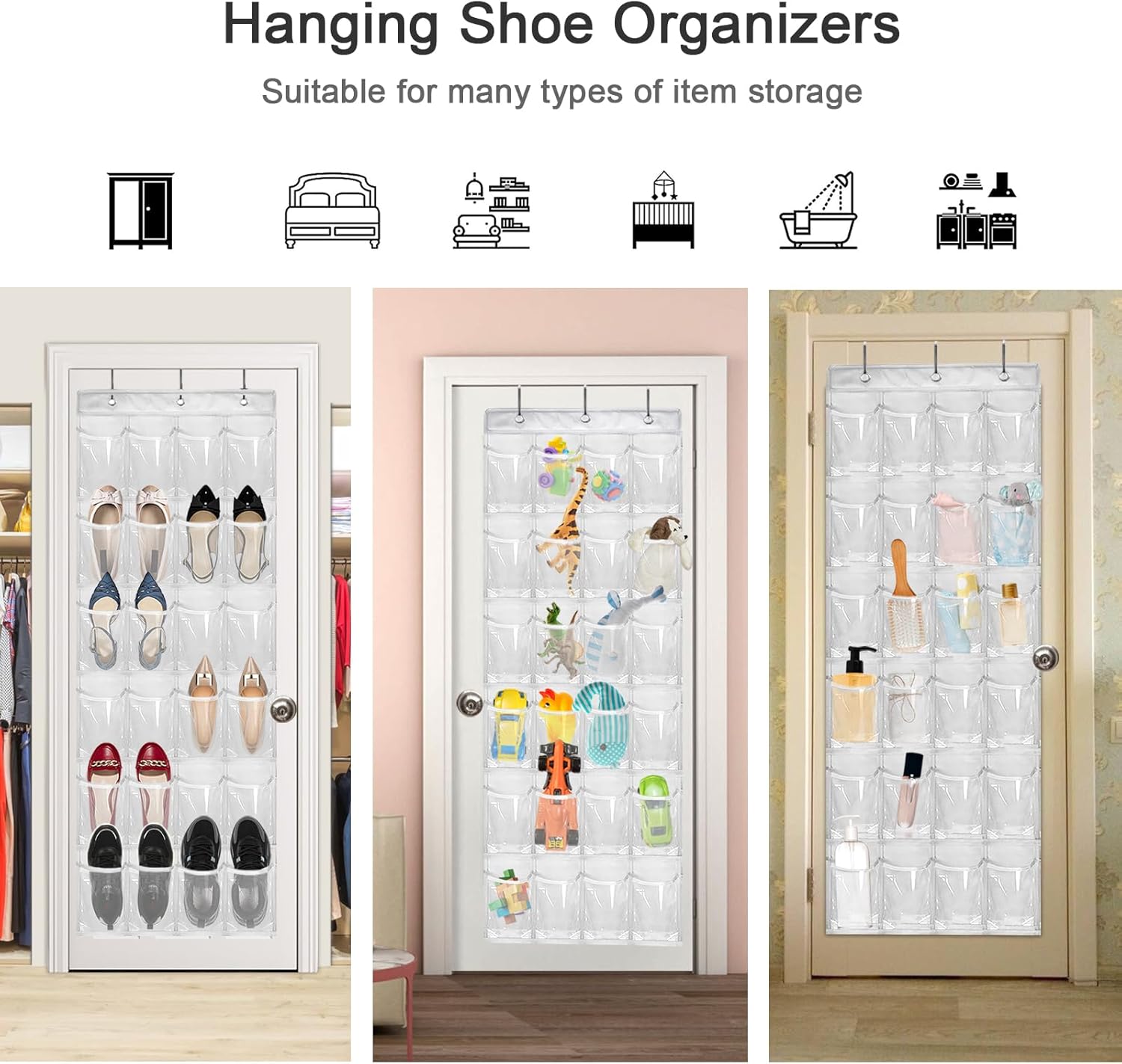 Over The Door Shoe Organizer with 24 Clear Pockets and Metal Hooks – Heavy Duty Hanging Shoe Storage Rack for Closet, Bathroom, Dorm – Space Saving Organizer for Shoes, Accessories, Toys (White)