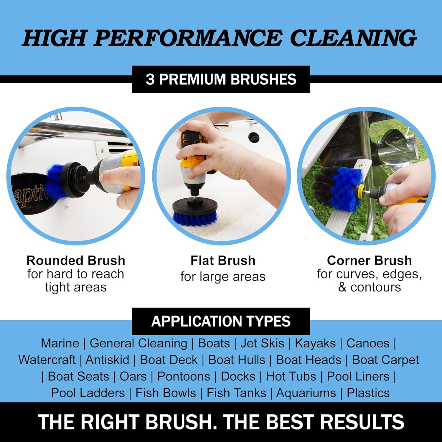 - ALL-IN-ONE BOAT CLEANING KIT: This versatile drill-powered brush kit tackles cleaning tasks on kayaks, canoes, personal watercraft, and party barges. Say goodbye to algae, pond scum, oxidation, and oily residue. Clean faster and spend more time enjoying the water with our professional-grade boat cleaning brushes for drills and impact drivers.