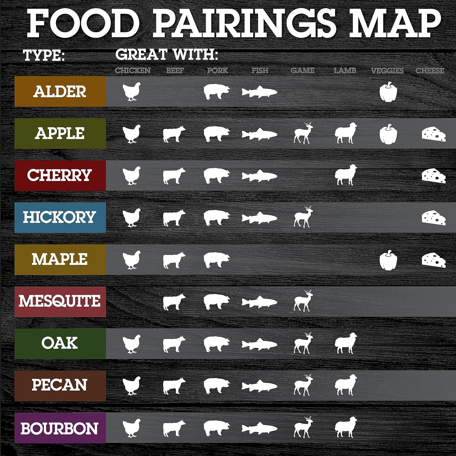 - Bourbon soaked oak wood infuses gentle bourbon flavor into your meal. Bourbon wood chips pair well with poultry, beef, pork, seafood, lamb, and game. Works particularly well with ribs, brisket, and venison.