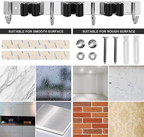 - 【2 WAYS TO INSTALL】- We offer two way to install this broom organizer wall mount:Screws drilling and self-adhesive.You can choosing the suitable install solution according to the intallation surface:Self-adhesive for smooth surface,Screws drilling for rough surface.It also can be disassembled and reused.