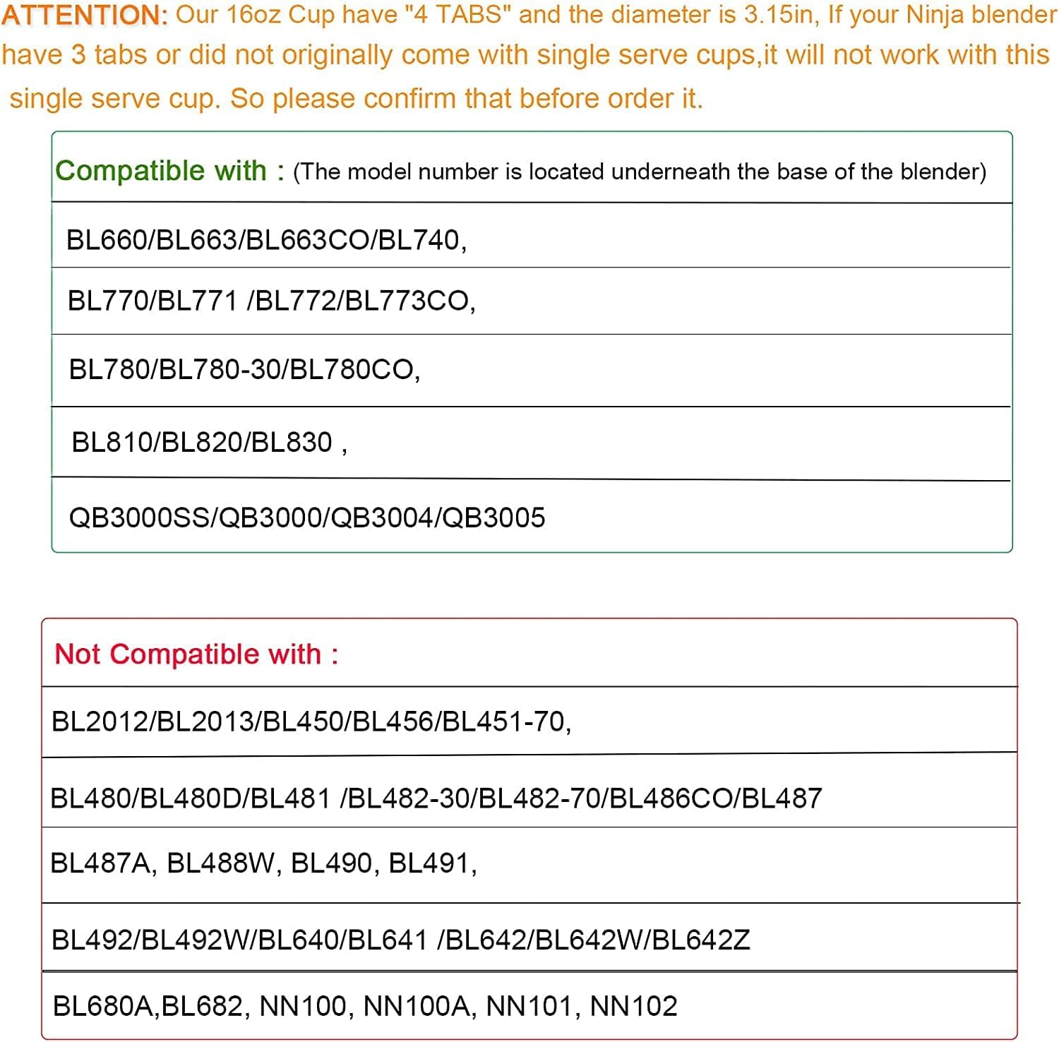 16oz Blender Cup Set Compatible with Ninja Replacement Parts, Single Serve Blender Cups+Sip & Seal lids for QB3001SS Fit Compact Personal QB3000 BL660 BL740 BL770 BL780 BL810