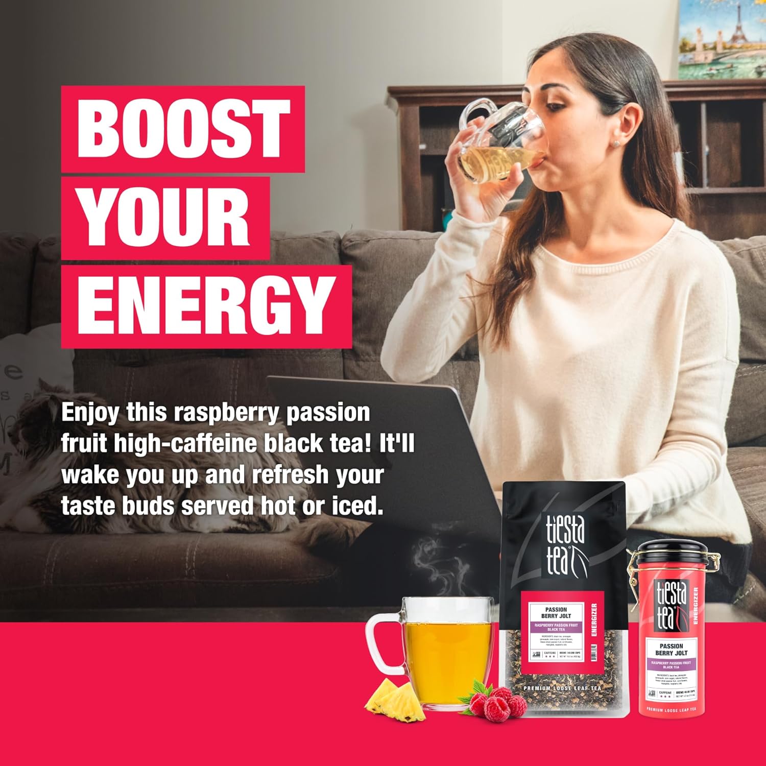 Tiesta Tea - Passion Berry Jolt, Loose Leaf, Raspberry Passion Fruit Black Tea, Premium High Caffeinated Black Blend, Make Hot or Iced, 16oz Bulk Pouch & 4oz Refillable Tin Combo