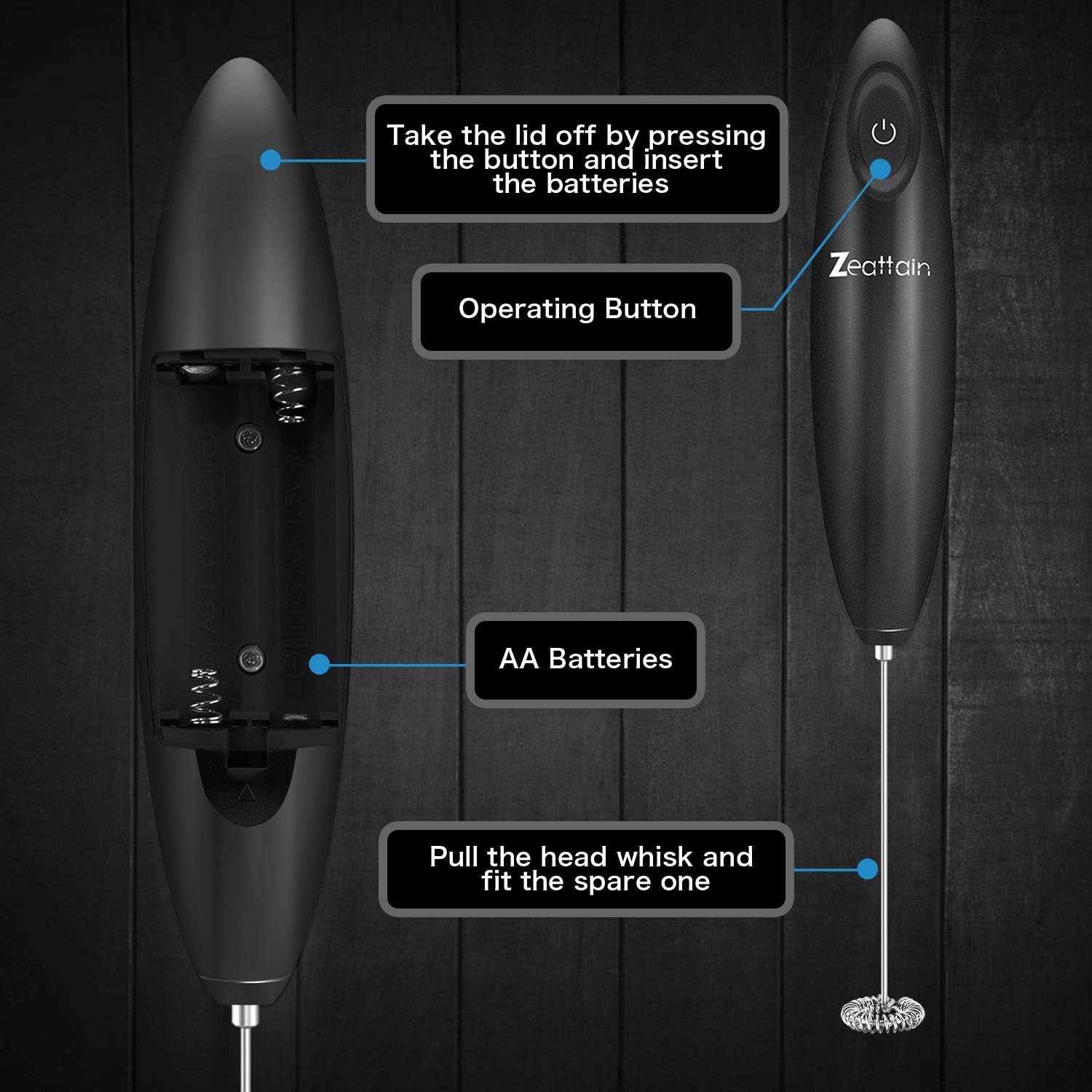 - One-Touch Operation: Zeattain electric milk frother is battery powered so you don't have to worry about cords and finding sockets. The hand held coffee frother uses a one-button switch design; all you have to do is holding the power button constantly, enjoy the foaming process, and whip the drink - Milk/Coffee/Frappe/Latte/Matcha/Hot Chocolate to your desired consistency since you know your tastes best.