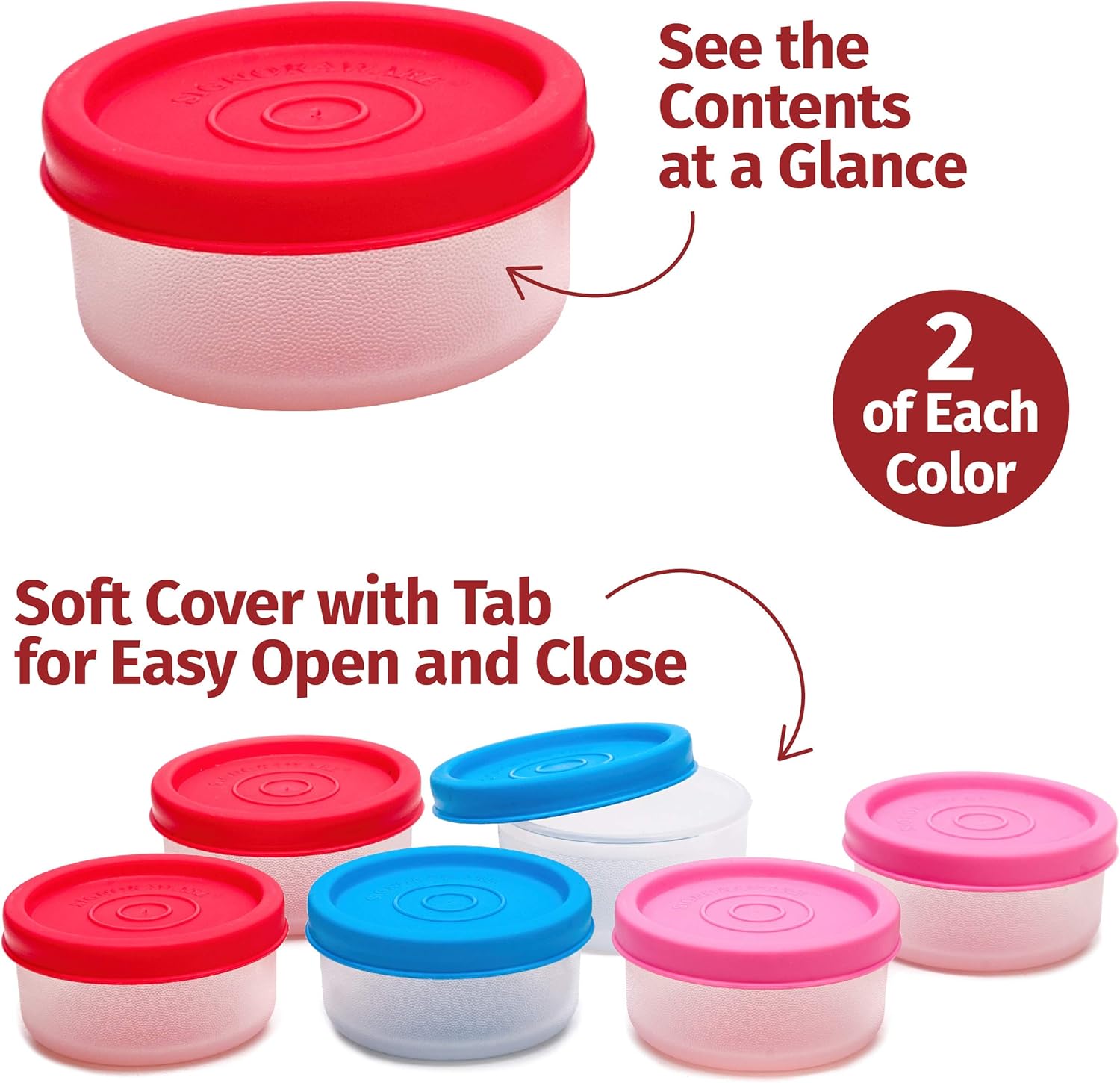 - VARIOUS SIZES AVAILABLE – each set contains 6 plastic food containers with lids in 3 colors (2 lids in each color). Please select the size you require when making your purchase. Sizes available are: Nano Round 1.3 oz., Mini Mate 2.3 oz., Cute Containers 3 oz., Mini Fresh 4 oz., Handy Square 5 oz., Tiny Wonder 6.5 oz., Executive Round Med. 10 oz