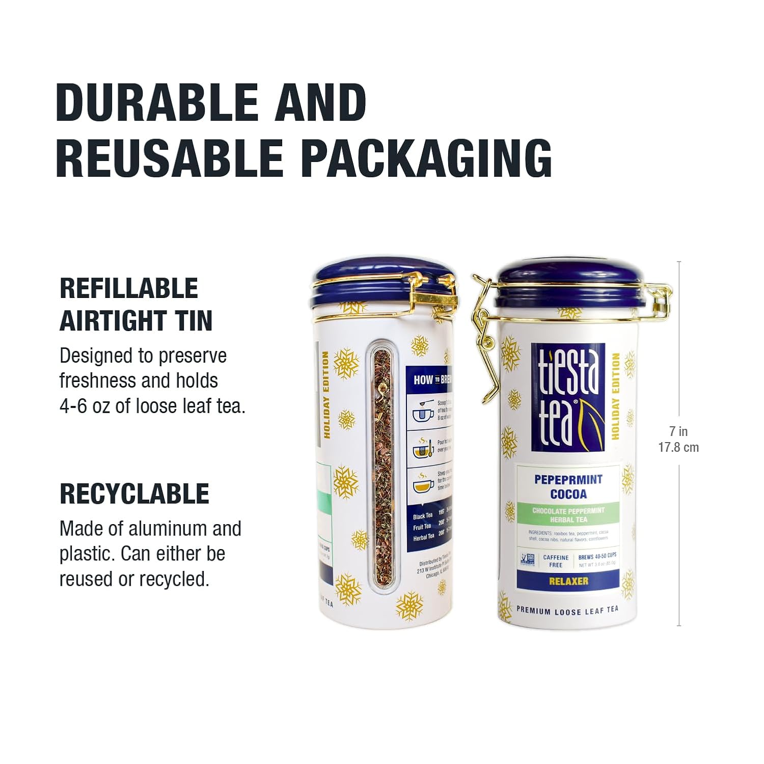 - REUSABLE TEA TIN FOR TEA LOVERS: Brew 40–50 cups of delicious loose leaf herbal tea with our airtight, resealable tea tin. It keeps your caffeine free loose leaf tea fresh, fragrant, and organized—perfect for everyday enjoyment or as a stylish gift for fellow tea enthusiasts.