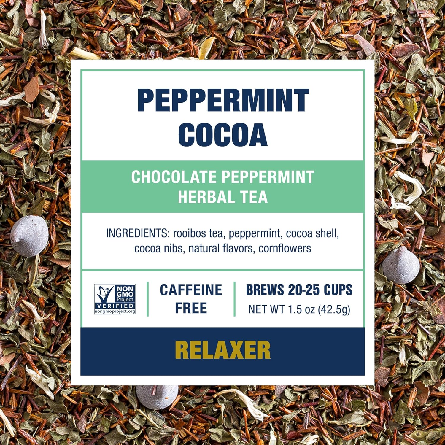 - PREMIUM LOOSE LEAF TEA BLEND: Experience our artisan blend of organic rooibos, crisp peppermint, velvety cocoa shells, and crunchy cocoa nibs in this caffeine-free premium loose leaf tea. Each steep releases a rich aroma and natural sweetness, delivering a smooth, indulgent flavor that satisfies discerning tea lovers seeking both comfort in every cup.