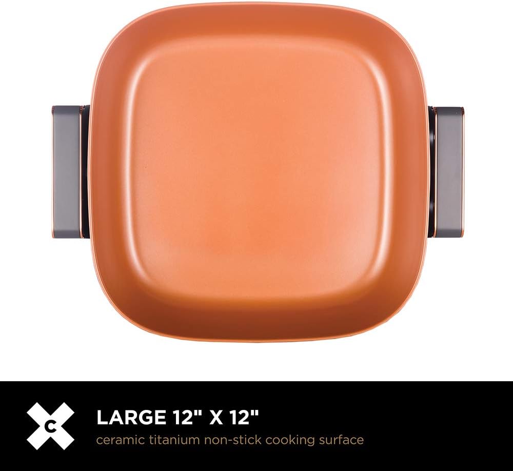 - COOK FOR A CROWD: CRUX electric fry pan features a non-stick copper ceramic coating that is ten times more durable than others and metal utensils safe. The large 12" x 12" surface lets you cook up a storm - perfect for larger meals and family gatherings