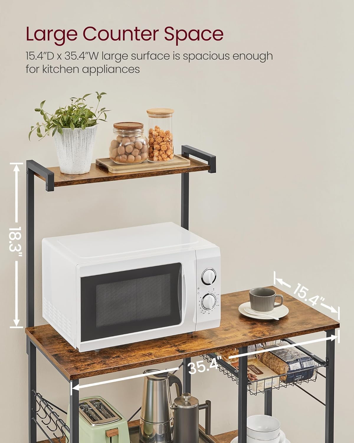 VASAGLE Baker's Rack, Microwave Stand, Kitchen Storage Rack with Wire Basket, 6 Hooks, and Shelves, for Spices, Pots, and Pans, Rustic Brown and Ink Black UKKS35X