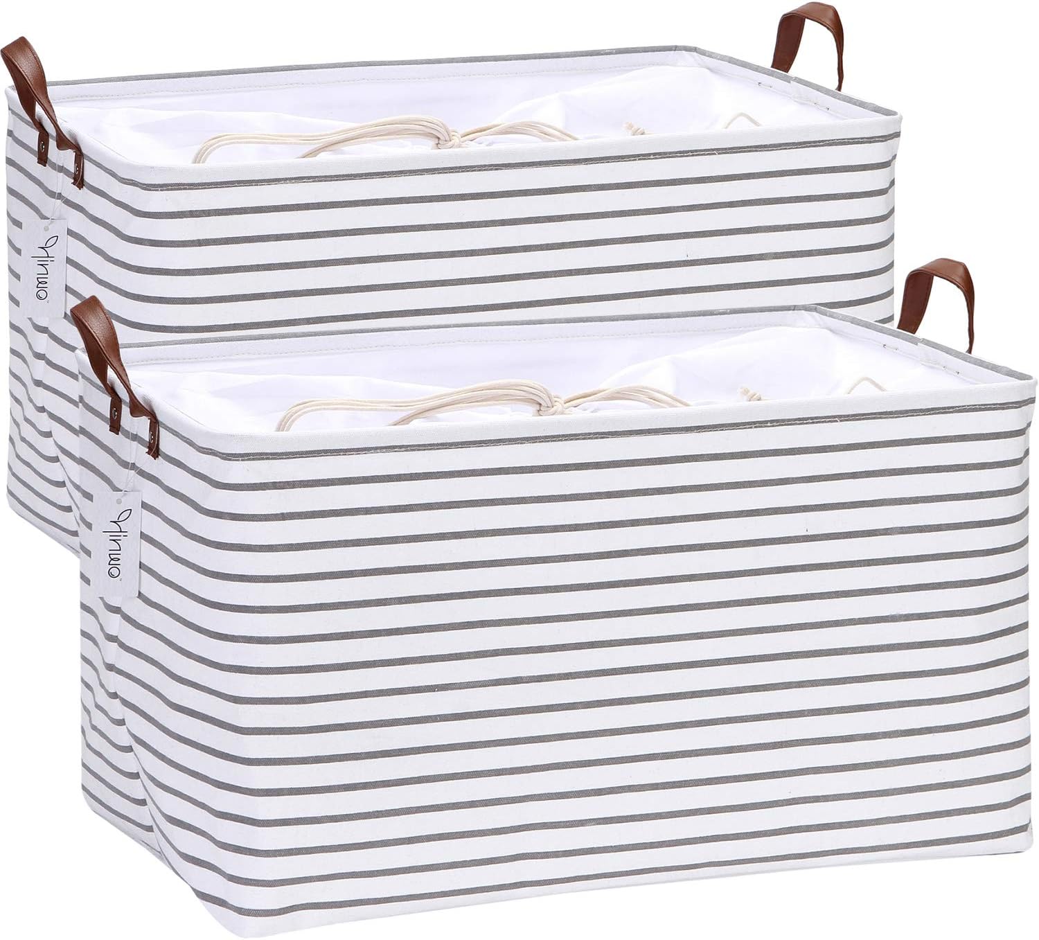 Hinwo 2-Pack Extra Large Canvas Fabric Storage Baskets with Handles, 70L Oversized Storage Bins, Collapsible Storage Box, Clothes, Toys, Blankets Organizers, 22 x 15 x 13 inches, (Grey Stripe)