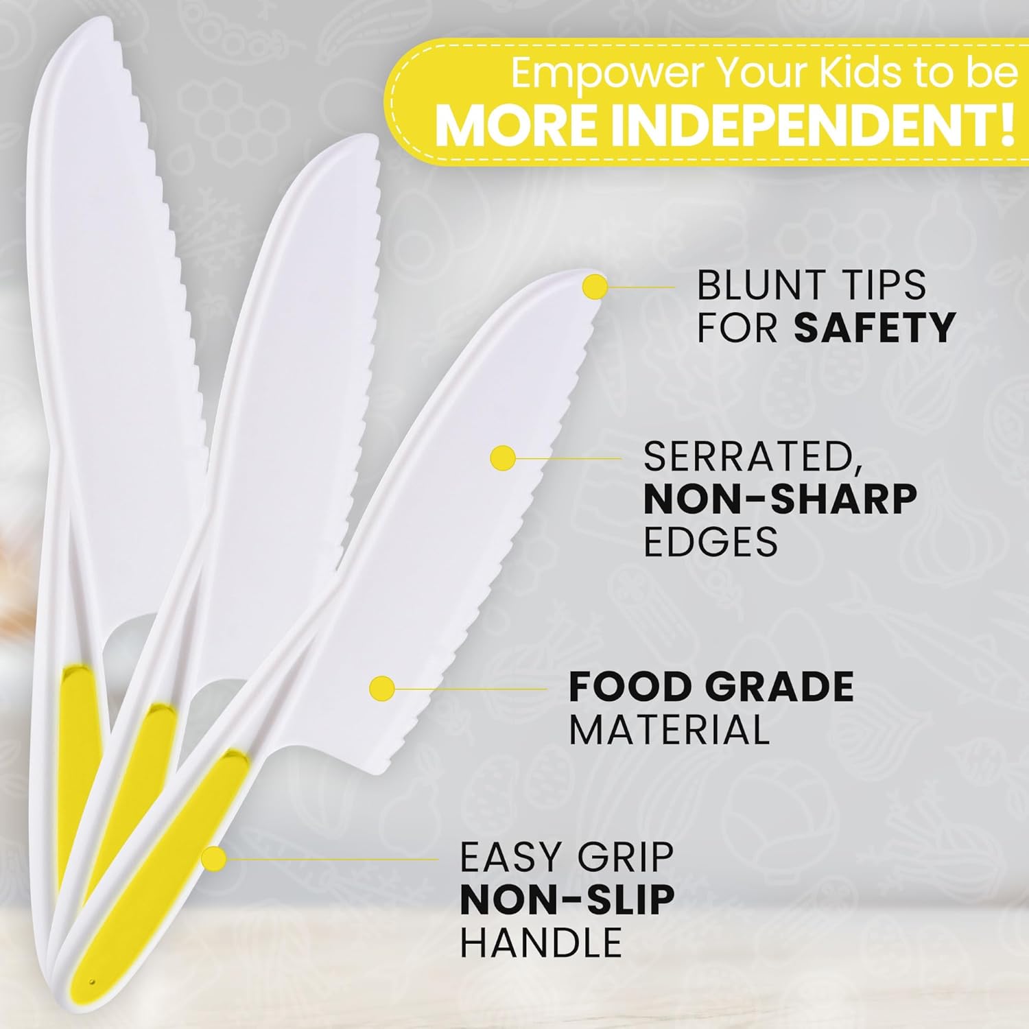 Zulay 3-Piece Kids Knife Set for Real Cooking & Baking - Toddler Knives for Cutting Fruits, Veggies, & Cake - Children’s Montessori Knife with Serrated Edges - Safe & Fun Lettuce Knife (Yellow)