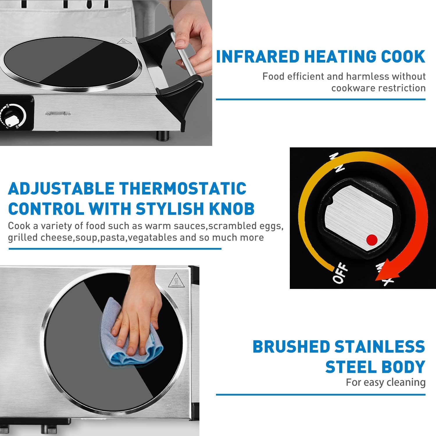 - ALL TYPES OF COOKWARE - Techwood electric stove can be used with any type of cookware in your home, such as aluminium pans, copper pans, cast lron frying pans and non-magnetic stainless steel pans can heats cookware efficiently with minimal heat loss. Ceramic panel and stainless steel body to withstand frequent use. Simply wipe with a clean cloth when cool.