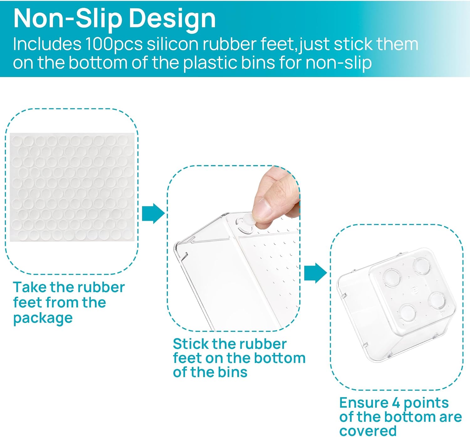- ✔Non-Slip and Durable -- Extra 100pcs silicone pads are included, just stick them on the bottom of the plastic trays for non-slip. Made of durable and clear plastic, so you can see what’s in it without digging around or making a mess, help you get a neat lifestyle.