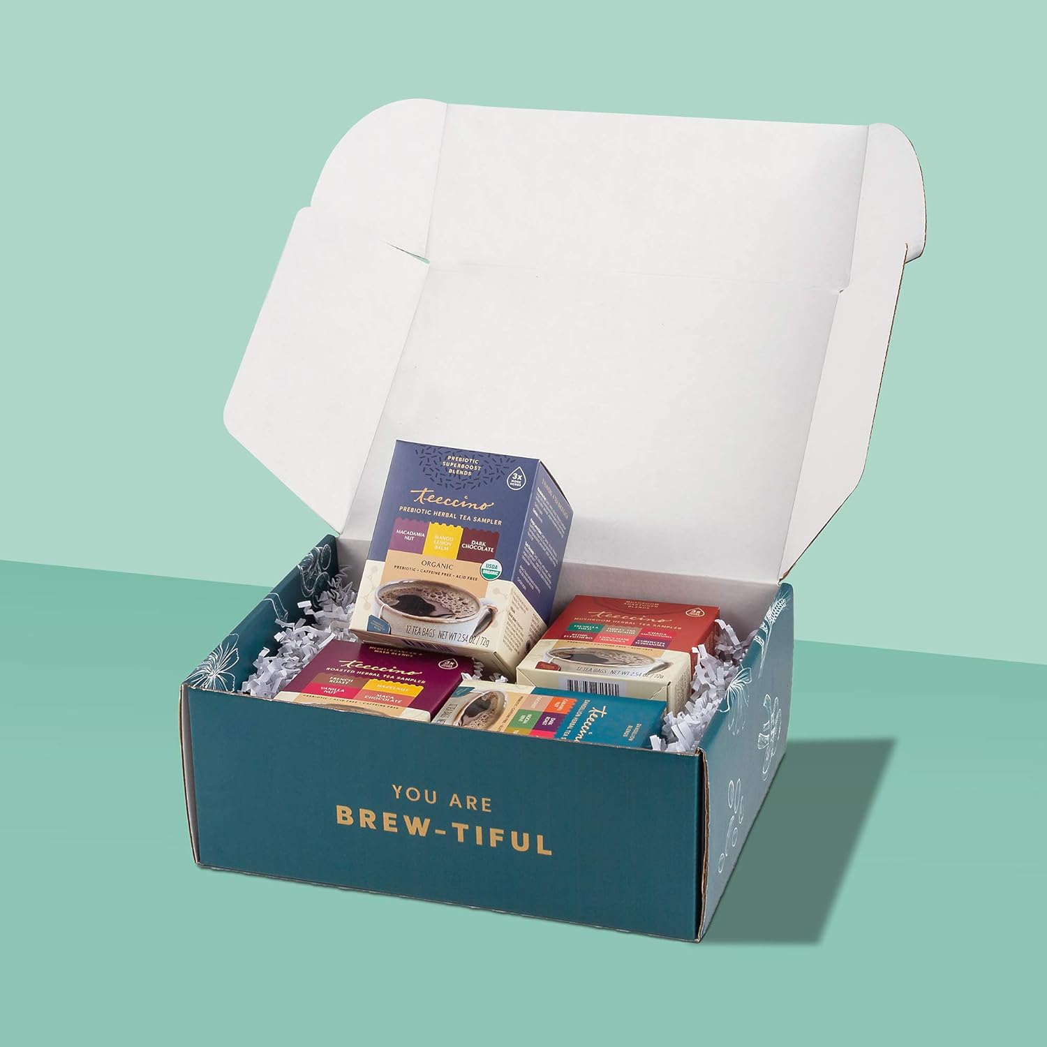 Teeccino Herbal Tea Gift Set - 48 Tea Bag Assortment in 4 Sampler Boxes with Decorative Gift Box - Prebiotic SuperBoost, Dandelion, Mushroom Adaptogen & Classic Herbal Tea Samplers, Caffeine Free
