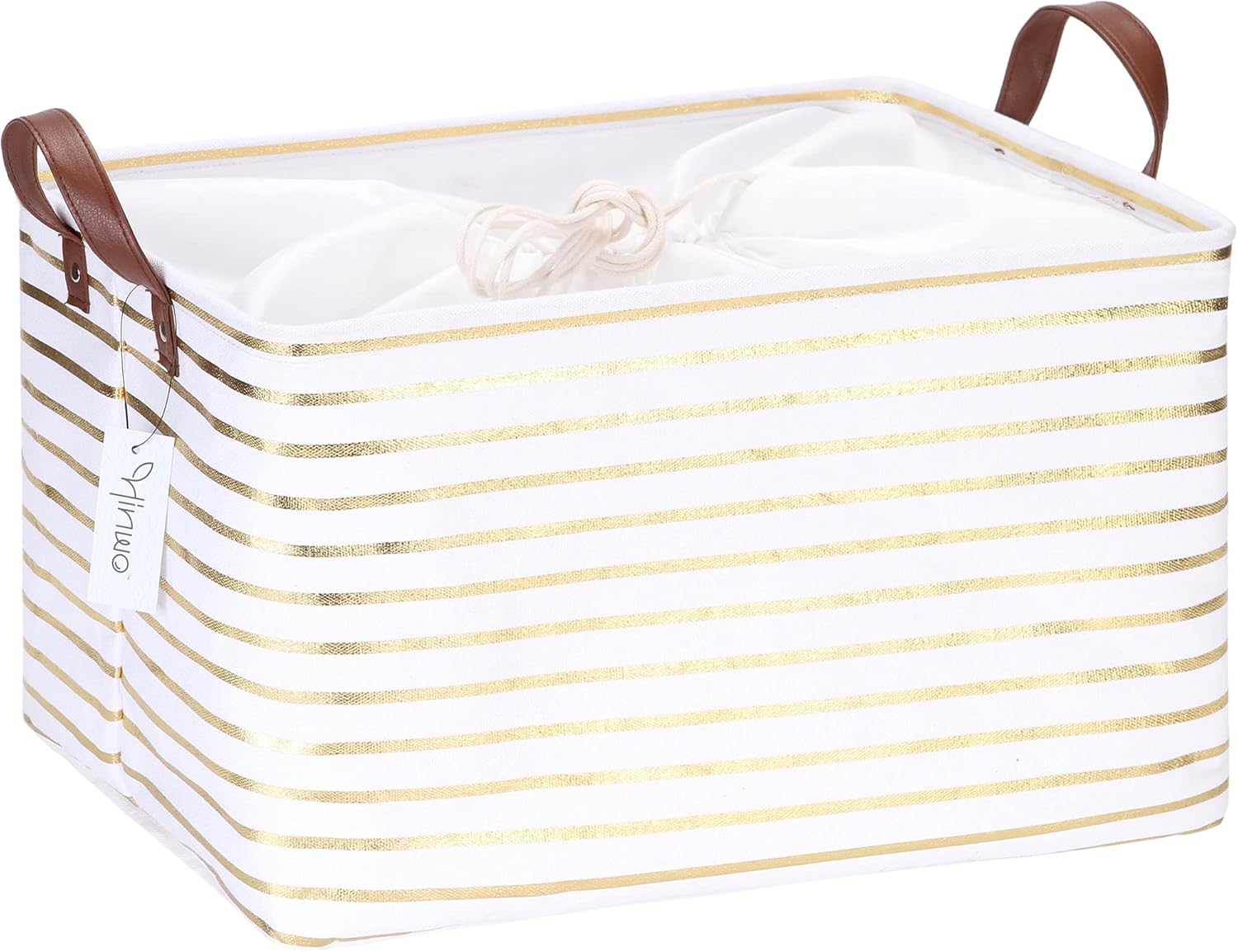 Hinwo 31L Large Storage Bins, Closet Organizers and Storage, Shelf Baskets, Foldable Clothes Storage Baskets with Handles, Containers for Clothing, Blanket, Towels, Toys, Bedding (Gold Stripe)