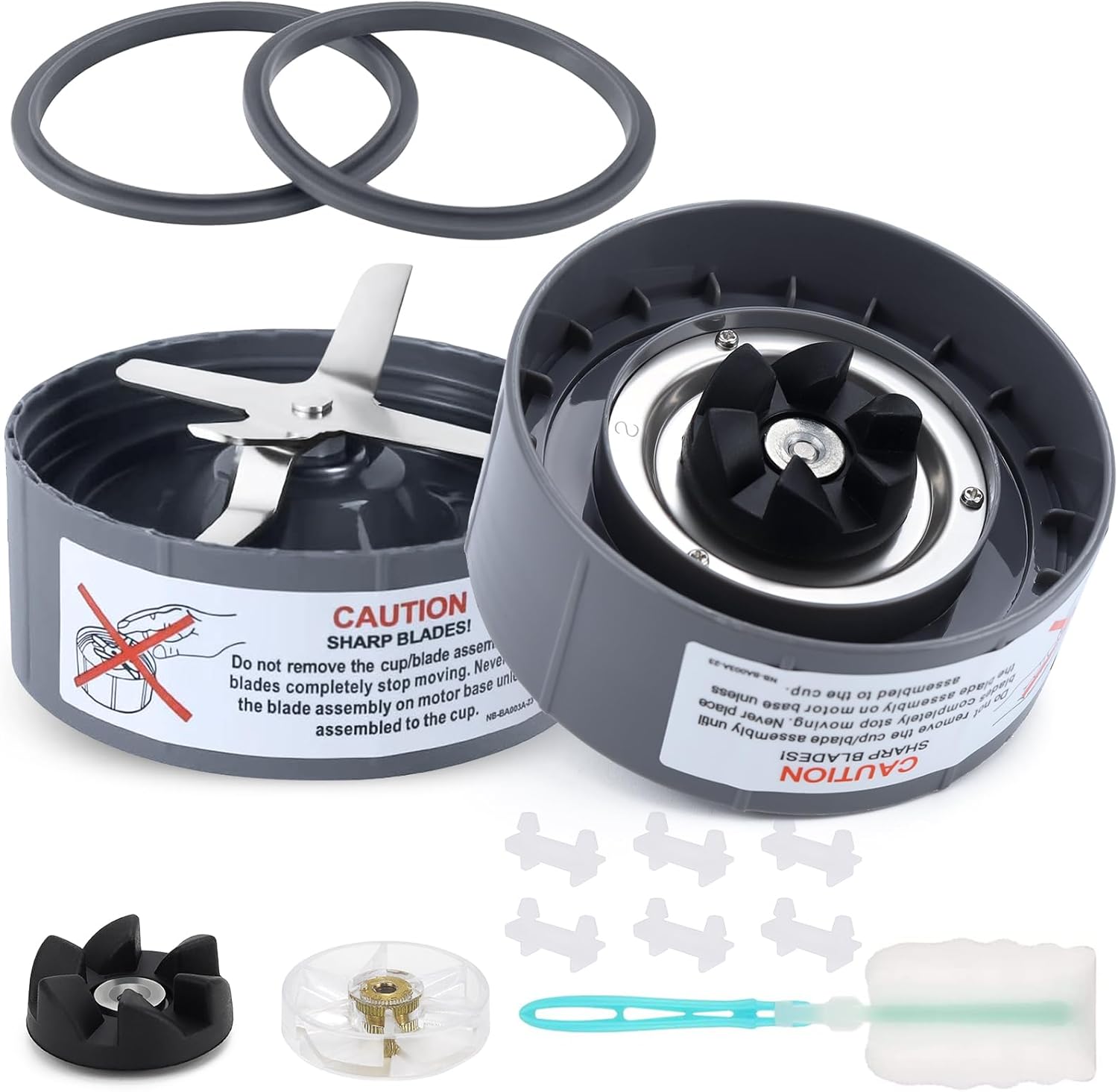 - Package Included: Total 13pcs, 2 replacement emulsifier cross blade assembly (Silicone Rubber Gasket O Ring pre-installed already in the blade). 2 Rubber Gasket, 6 Shock Pad, 1 White Motor Top Base Gear, 1 Black Rubber Gear, 1 Brush. Blade Size: Diam 4 in Height 1.6 in. Material type: Stainless Steel and Plastic Silicone