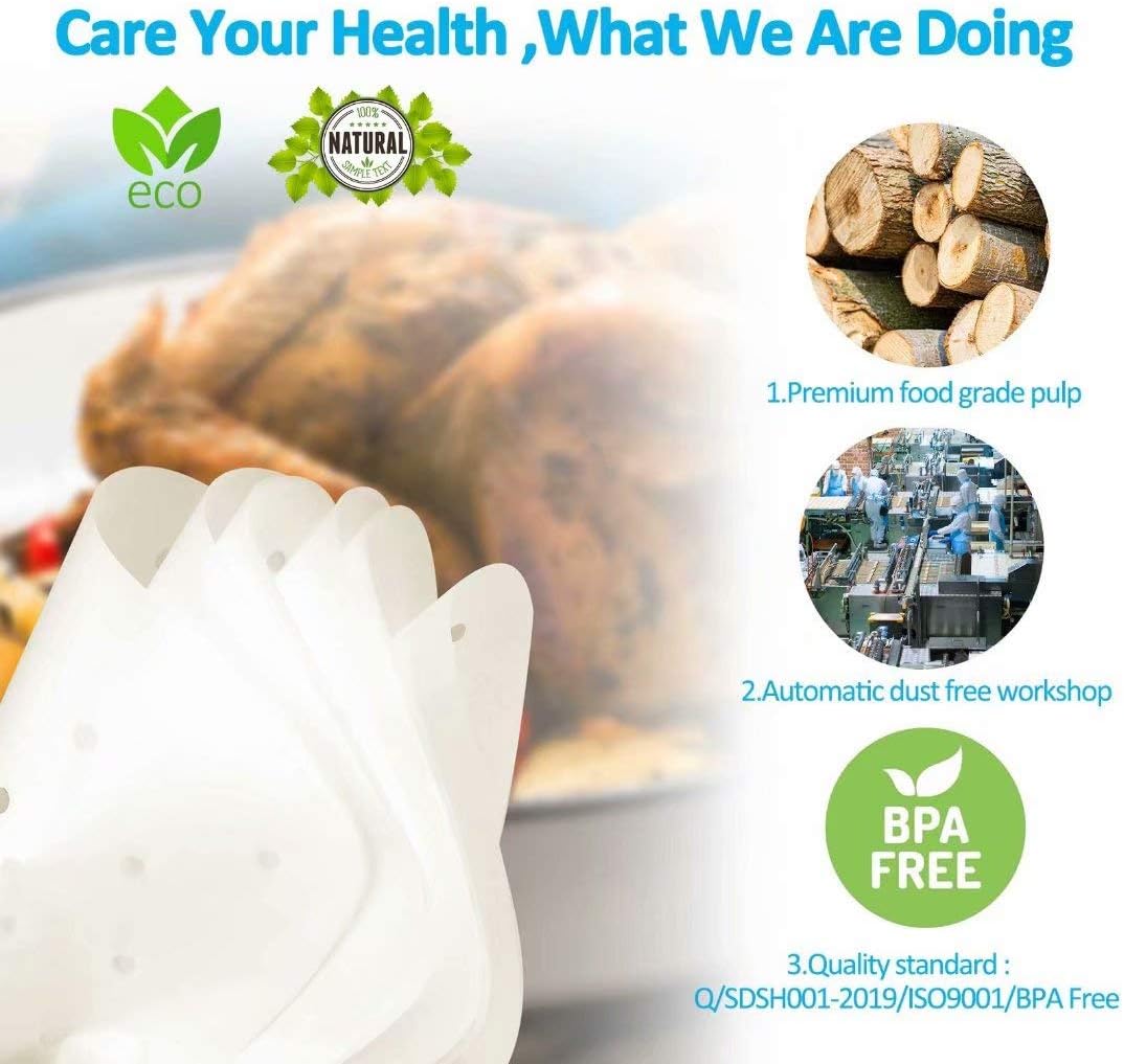 - 1【Healthy and Reliable】 DNSSY brand Air fryer parchment paper are made from premium food grade pulp, automatic dust-free workshop with strict international quality standard ensure each piece of our product are clean, safety, Unbleached,worrying free to contact foods directly