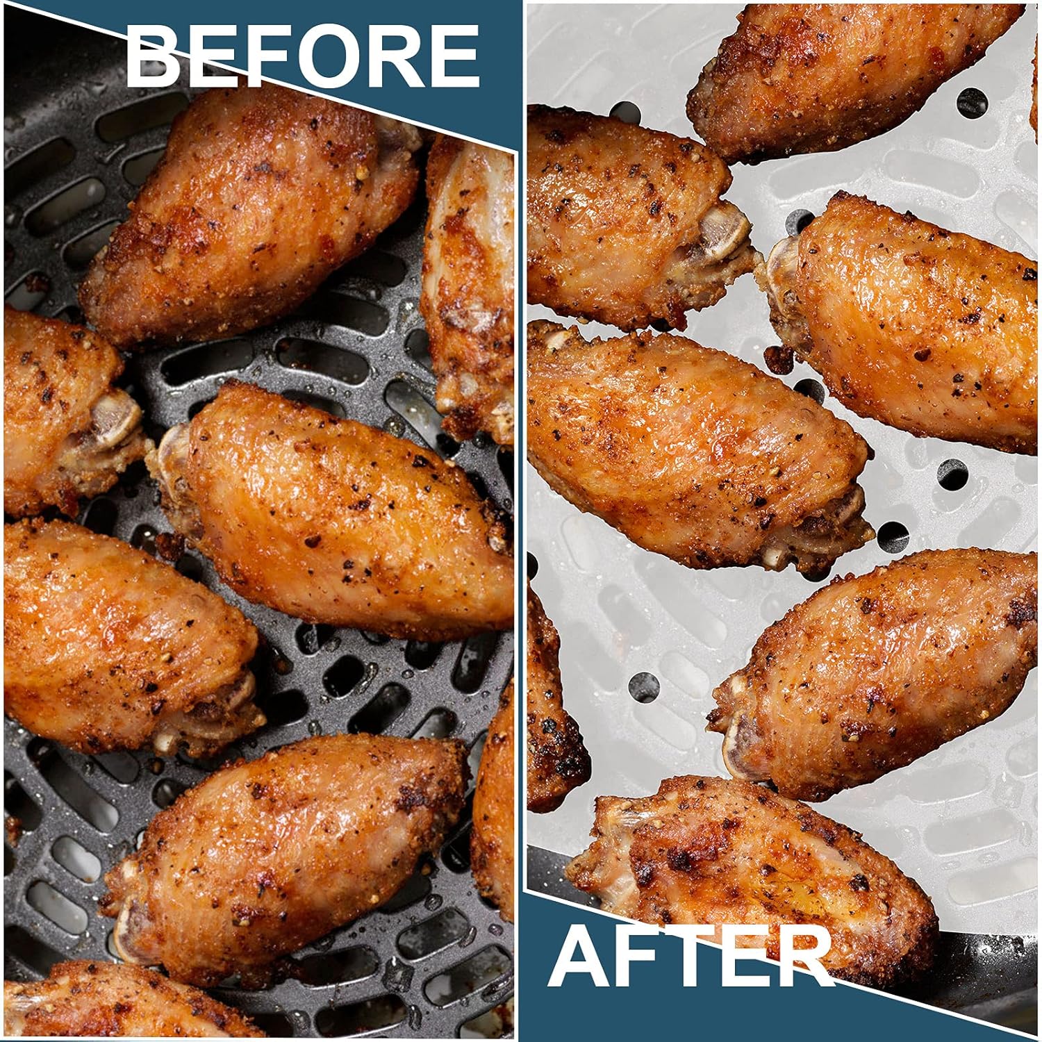 - 【Healthy & Safe】Air fryer parchment paper /paper for air fryer 100% food grade wood pulp, no fluoresce, non-toxic, odor-free. Our air fryer parchment paper made with nonstick food grade premium quality baking paper, prevent your food sticking on the paper, reduce the use of oils and butter, greaseproof and waterproof., enhancing the taste.