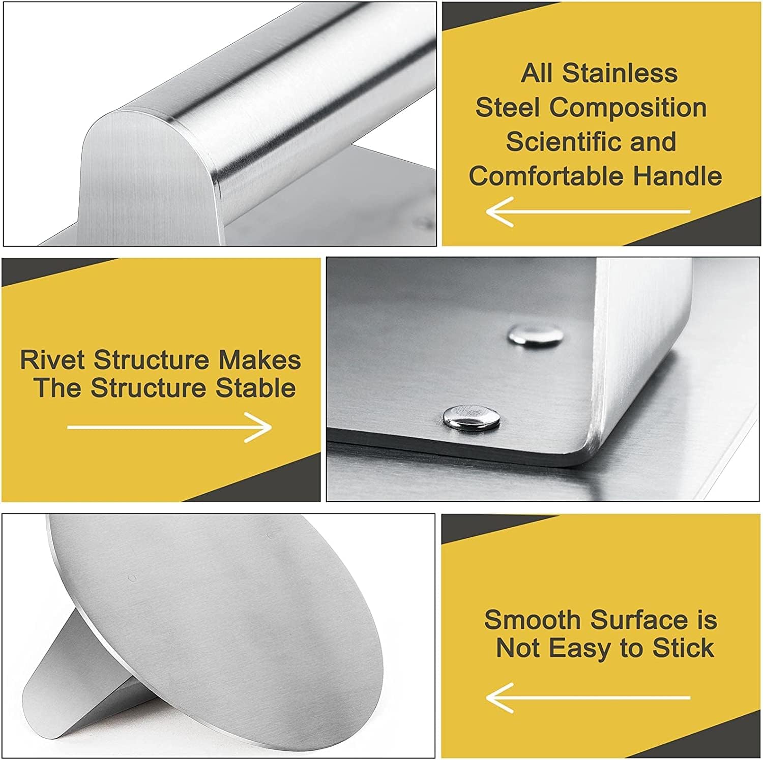 - High Quality Stainless Steel: The burger press made of Brushed Stainless Steel including grip handle, stain resistant and rustproof. The round grip handle adopt laser welding technology, which will not become loose over time, and it can stay firm for a long time