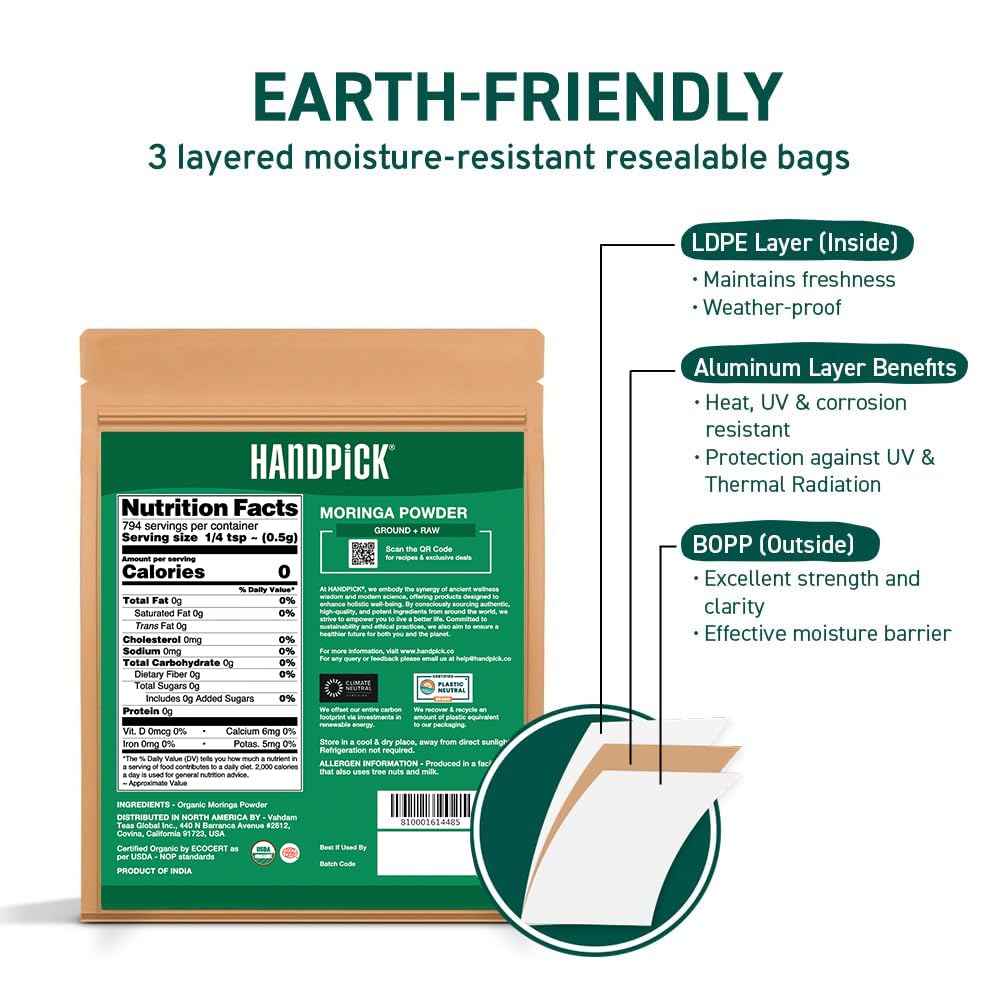 HANDPICK USDA Organic Moringa Powder (397g/14oz) Pure Moringa Oleifera Leaf Powder | Authentic Indian Origin | Gluten Free, Non-GMO | Perfect for Smoothies, Drinks, Tea & Recipes