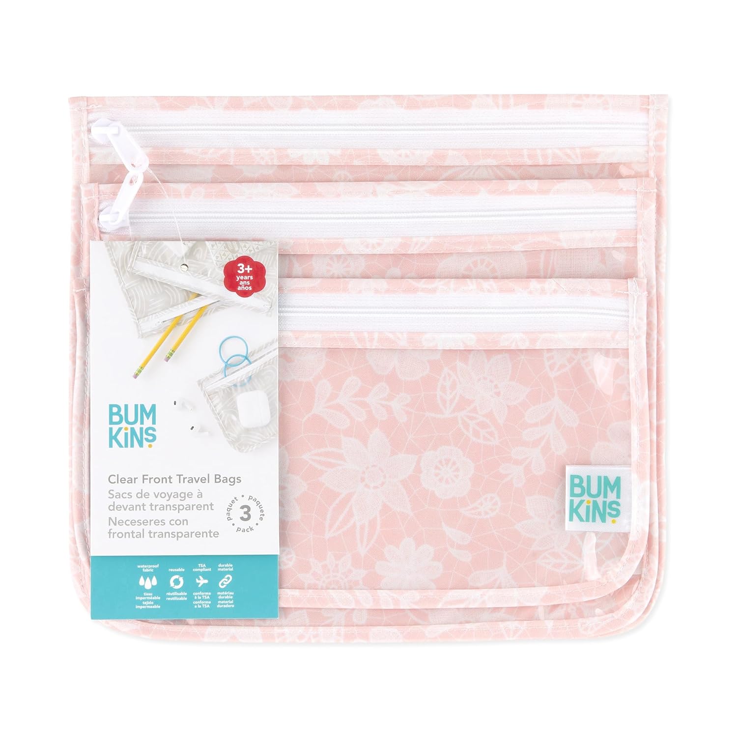 Bumkins Travel Bag, Toiletry, TSA Approved Pouch, Zip Bag, Quart Size Airline Compliant, Clear-Sided, Baby, Diaper Bag Organization, Makeup, Accessories, Packing, Set of 3 Sizes, Floral Gray