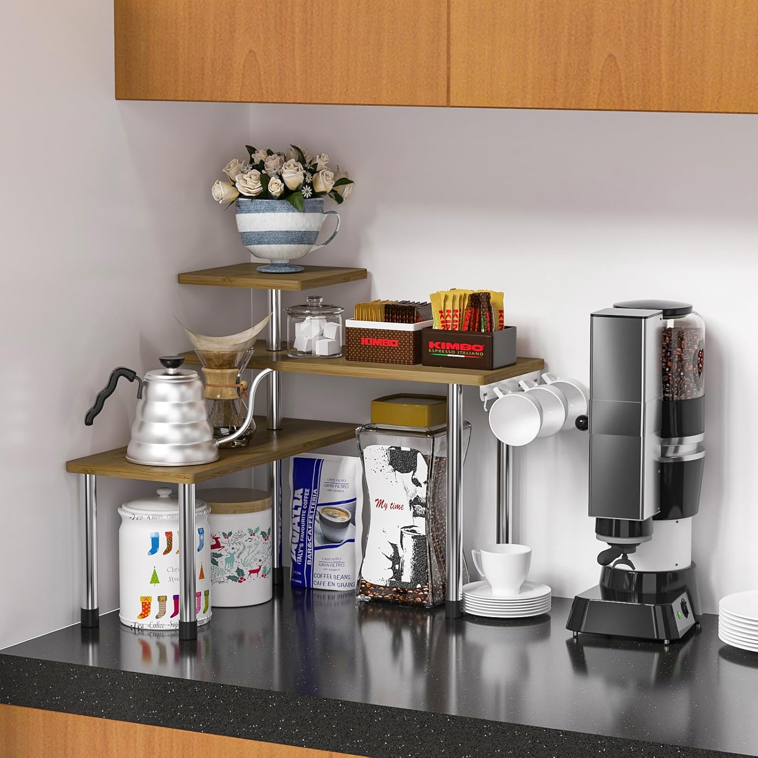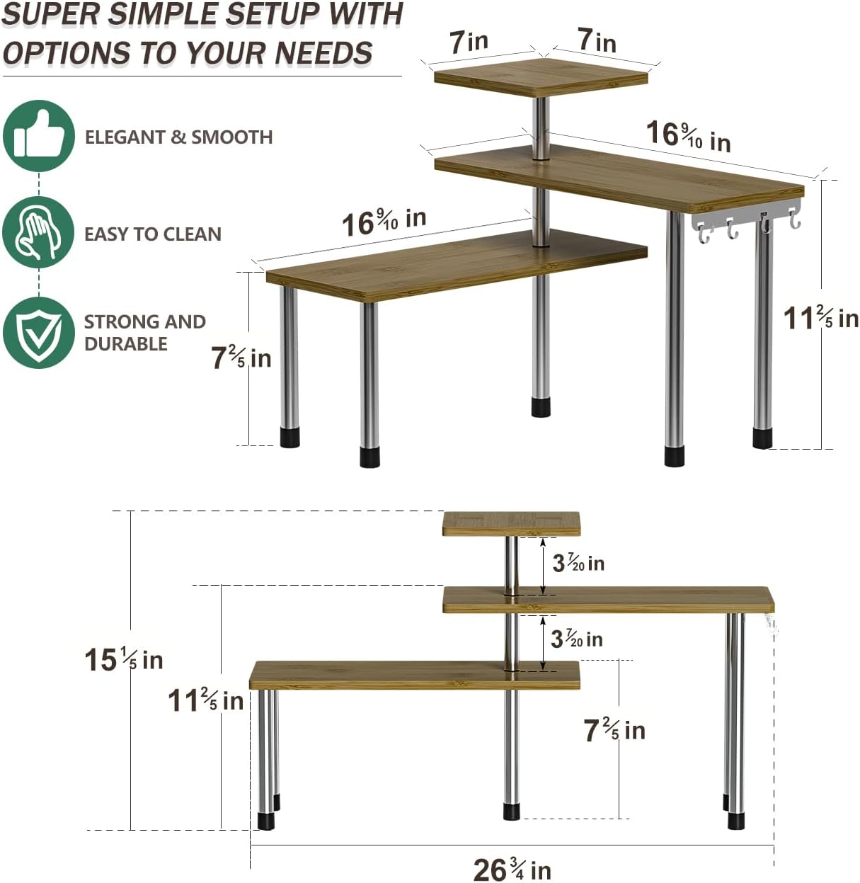 - CREATIVE DESIGN: The Position of the tiers is adjustable, which fits into your counter space much better in usability; makes your countertop neat & tidy; Freestanding design makes it easy to move wherever more storage is needed