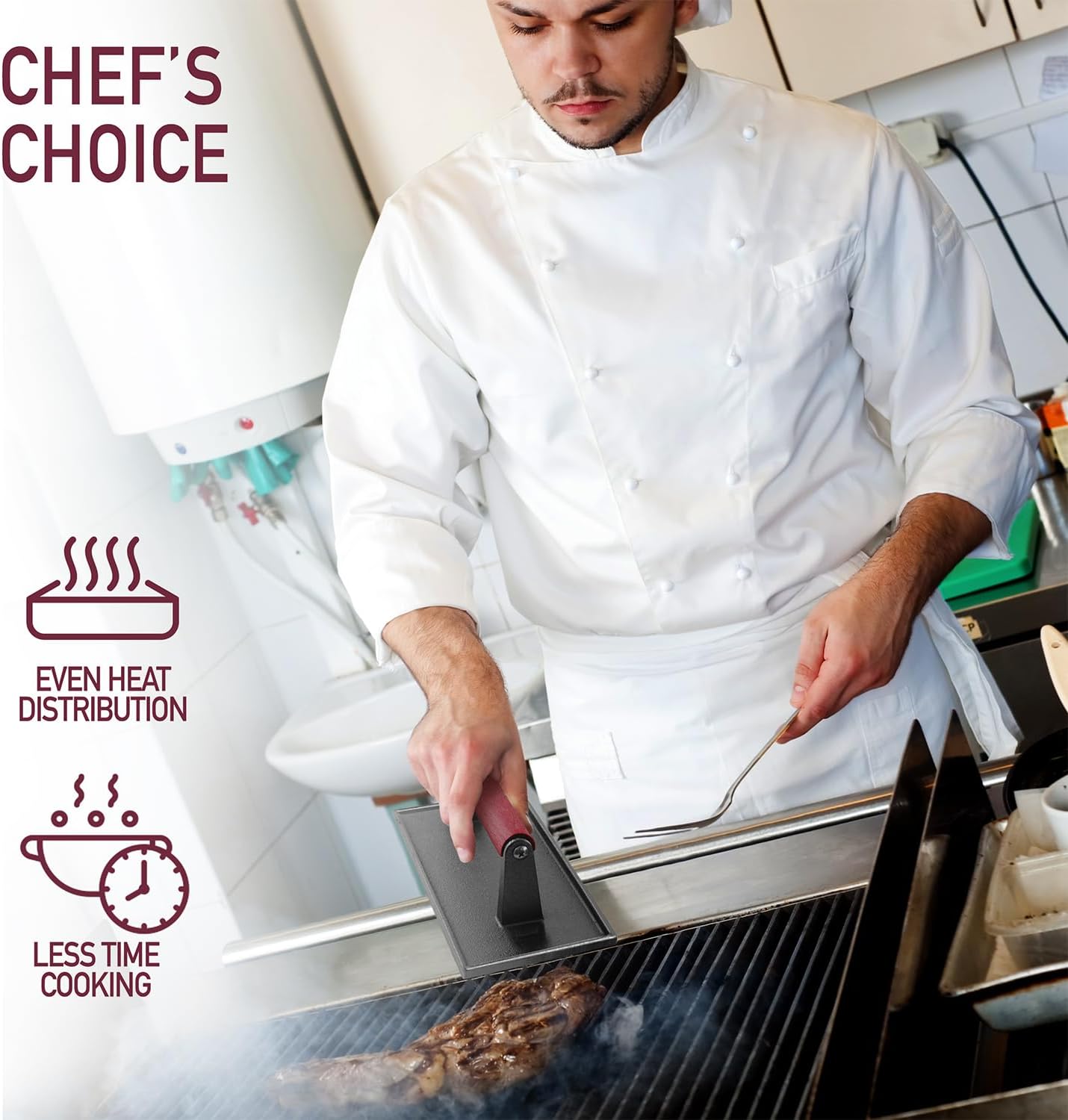 - Get Perfectly Seared Meat - With its wide design, this flat top grill press helps you cook food evenly. Adding weight on your meat also results in bold grill lines that make food look more delicious.