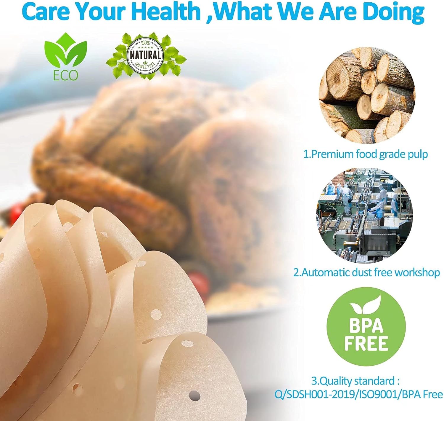 - ●【Healthy and Reliable】 DNSSY brand Air fryer parchment paper are made from 100% unbleached natural food grade wood pulp, eco-friendly , automatic dust-free workshop with strict international quality standard, worrying free to touch foods directly