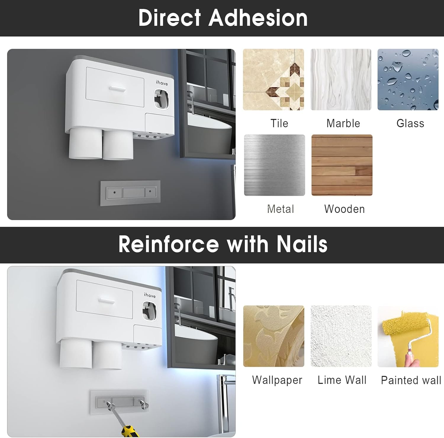 - Sturdy: Our toothbrush holder wall mounted uses a patented non-marking adhesive strip with an excellent caulking effect in humid environments, making it firmly bonded regardless of metal, wood, mirror, ceramic tile, or marble. If the wall is uneven, painted, or wallpaper, we have prepared nails for you to drill and reinforce the mounting. This adaptable design makes it a versatile solution for any home.