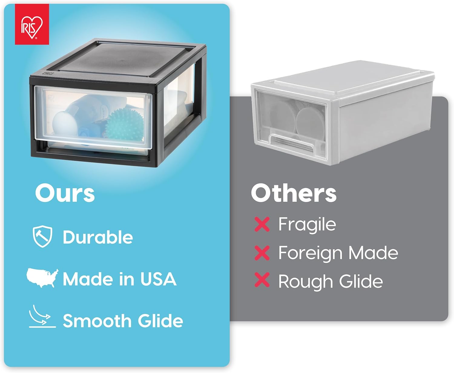 - MADE IN USA with global materials - The IRIS USA plastic stacking drawers offer a practical storage solution for any room in your home. Keep small, similar things together or use them for storing frequently used and replenished items such as snacks, vitamins and medicine, stationery, craft supplies, and more.