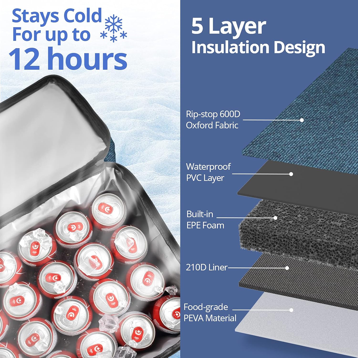 - STAYS COLD LONGER - Thoughtful 5 layer insulation design. Exterior surfaces are made of rip-stop 600D Oxford materials plus one layer of waterproof PVC. Interior layers are thicker, reinforced food-grade PEVA materials with seamless ultrasonic welding for 100% leakproof and tear-resistance. A built-in EPE foam middle layer and 210D liner add additional insulation, allowing the Maelstrom Icy Hollow Soft Sided Cooler Bag to keep food or drinks cold for up to 12 hours.