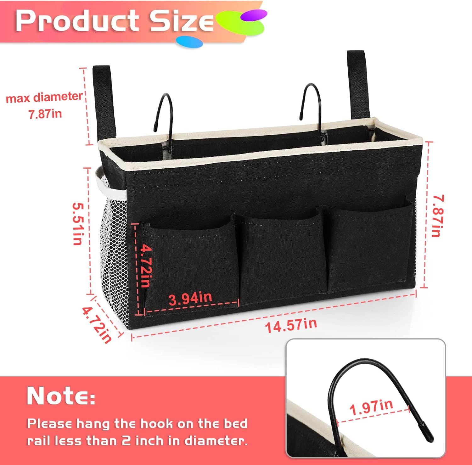 - 【Size Information】The bedside caddy overall size: 14.57x4.72x7.87 inch; Pockets size: 3.94x4.72 inch; Note: Our bedside organizer caddy hanging storage is suitable for dormitory bunk beds with a bed rail diameter less than 1.97 inch.