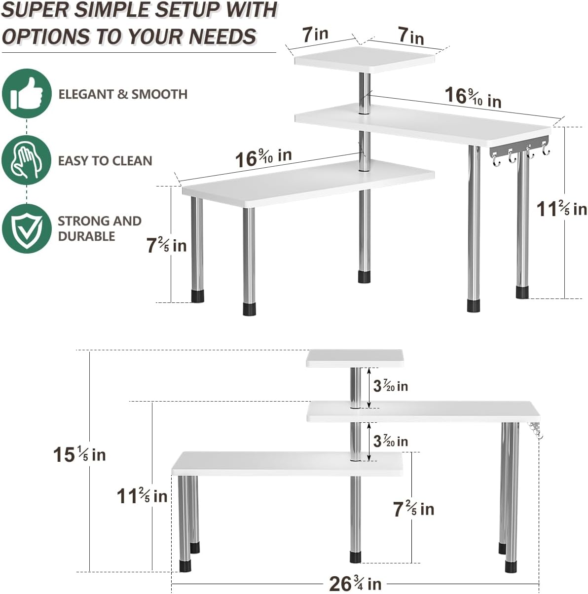 - STYLISH DESIGN: The white bathroom countertop organizer is designed to fit into corners and make better use of every inch of valuable counter space; the adjustable position of each tier and freestanding design makes it easy to move where more storage is needed