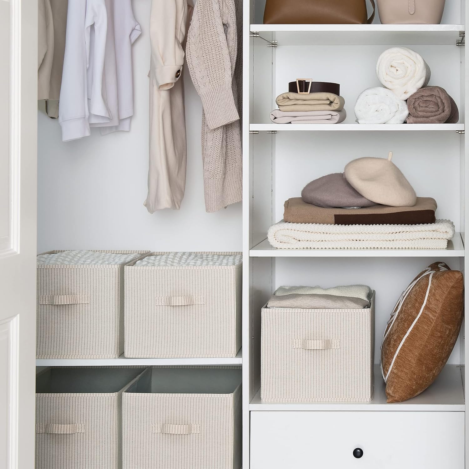 StorageWorks Storage Baskets for Shelves, Foldable Fabric Closet Storage Bins with Handles, Fabric Storage Bins Clothes Organizer, Beige Stripes, 3-Pack, Extra Large