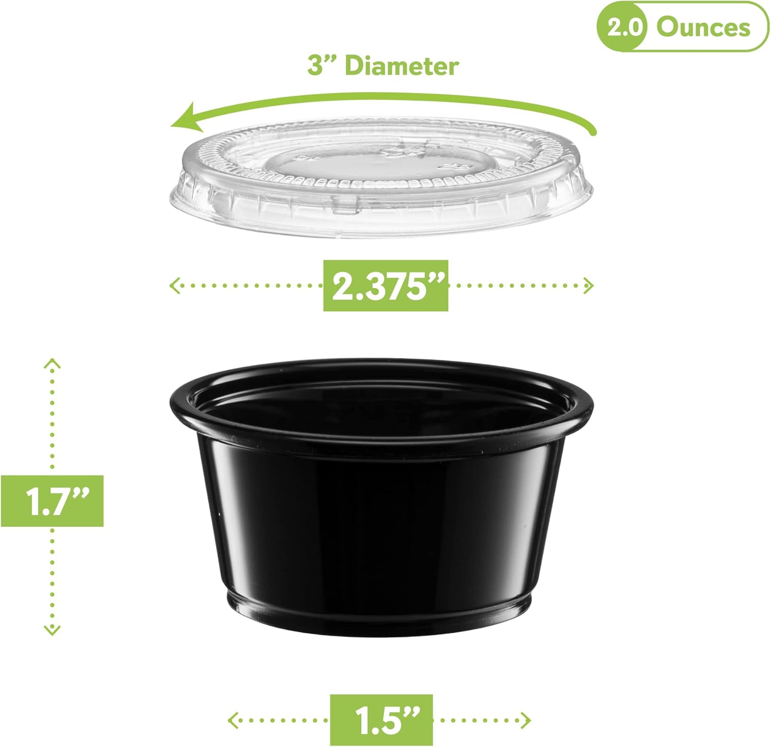 - {2 oz - 100 Sets} Black Diposable Plastic Portion Cups With Lids, Small Mini Containers For Portion Controll, Jello Shots, Meal Prep, Sauce Cups, Slime, Condiments, Medicine, Dressings, Crafts, Disposable Souffle Cups & Much more
