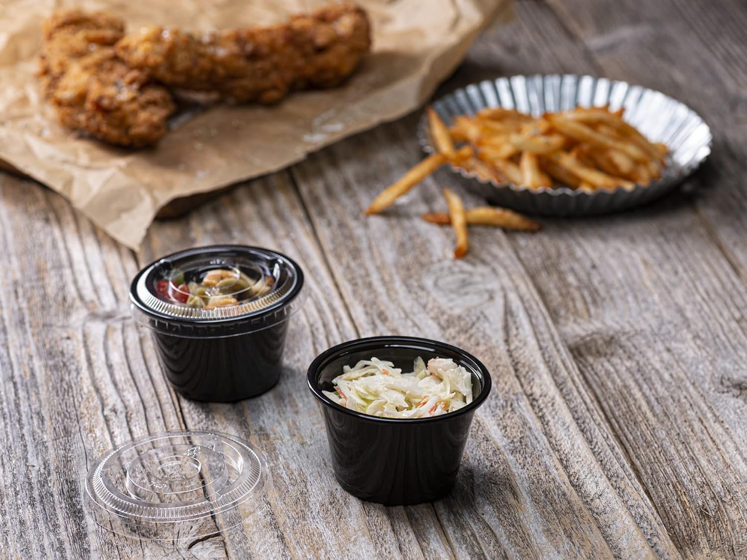 - Includes 100 sets of 4 ounce Black Portion Cups & lids