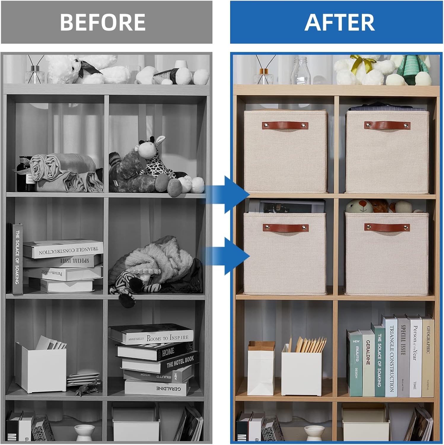 - MULTI-PURPOSE STORAGE CUBES: Ideal for a variety of basic household storage needs, helping to keep your living spaces neat. The storage cubes can be used as 11 storage cube bins for cube storage, towel storage, book/magazine organizer, and many other uses Due to the light when shooting difference and other natural reasons and display resolution is different, there is a little color difference is normal, You can rest assured that our product is premium quality