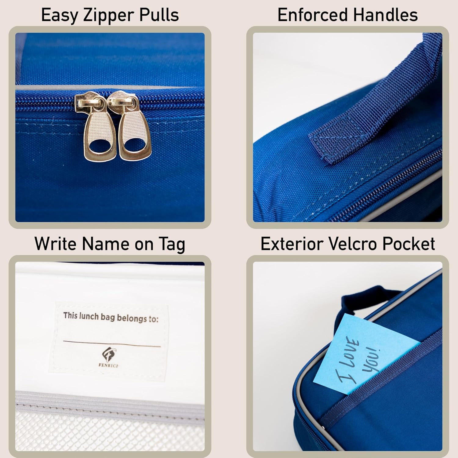 - MULTIPLE POCKETS FOR ORGANIZATION: We feature 1x exterior pocket with hook and release for napkin and extra storage and 1x interior mesh pocket for cold pack, utensils, and snacks.