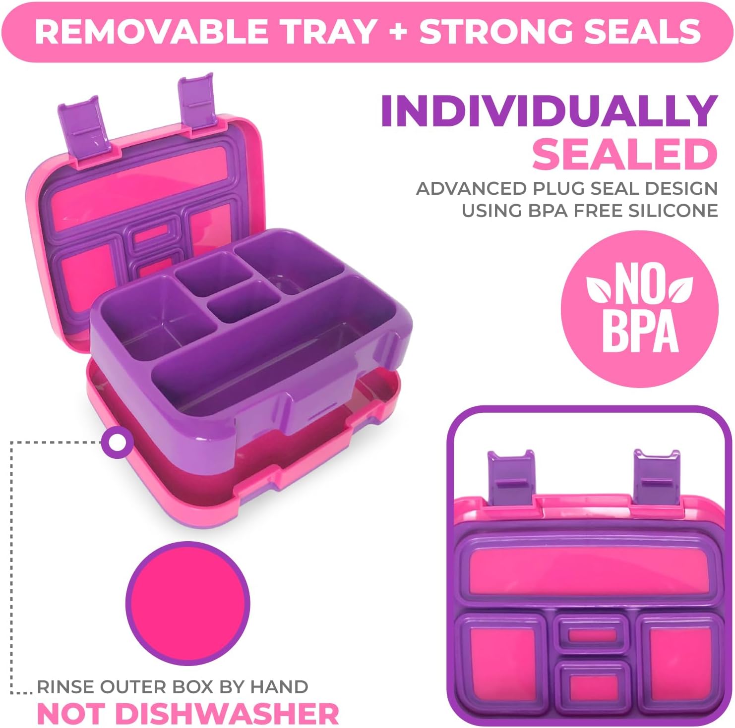 - DURABLE Leak Resistant Container – Along with a secure design, drop-resistant rubberized trim and easy-open latches for small hands these bento boxes for kids lunches feature a removable inner tray that’s microwave and dishwasher safe for versatile food prep and quick cleanup.BPA and phlalate free. WASH OUTER BOX BY HAND to maintain seal shape.