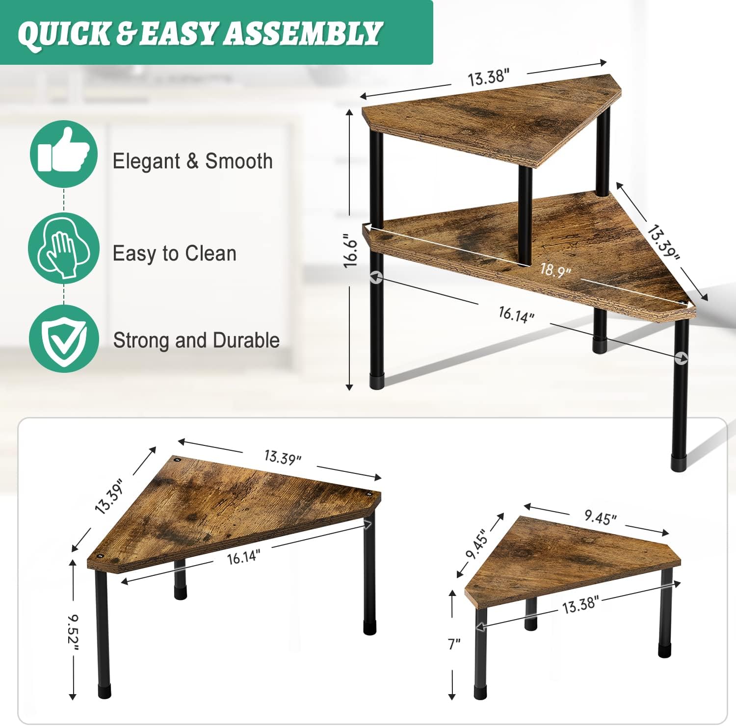 - EASY ASSEMBLY & PRACTICAL: Clear and easy-to-read instructions, just a few steps to install with hardware; 2 tier design shelf saves storage space and the shelves can be used on right and left corners