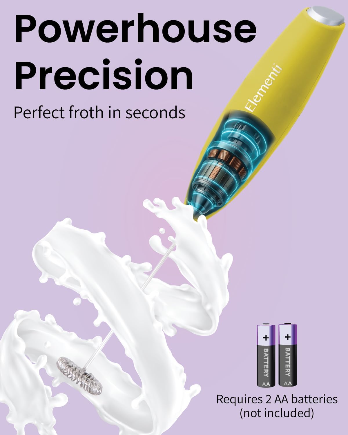 Elementi Milk Frother Handheld - Electric Coffee Mixer for Lattes, Cappuccinos and Cold Foam - Compact Drink Frother Wand for Barista-Style Beverages (Yellow)